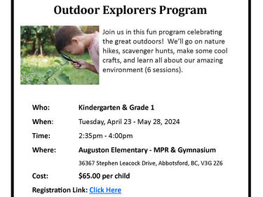 - Outdoor Explorers Program – Multi Purpose Room & Gym 6 sessions – Grades K – 1 - $65.00 per child